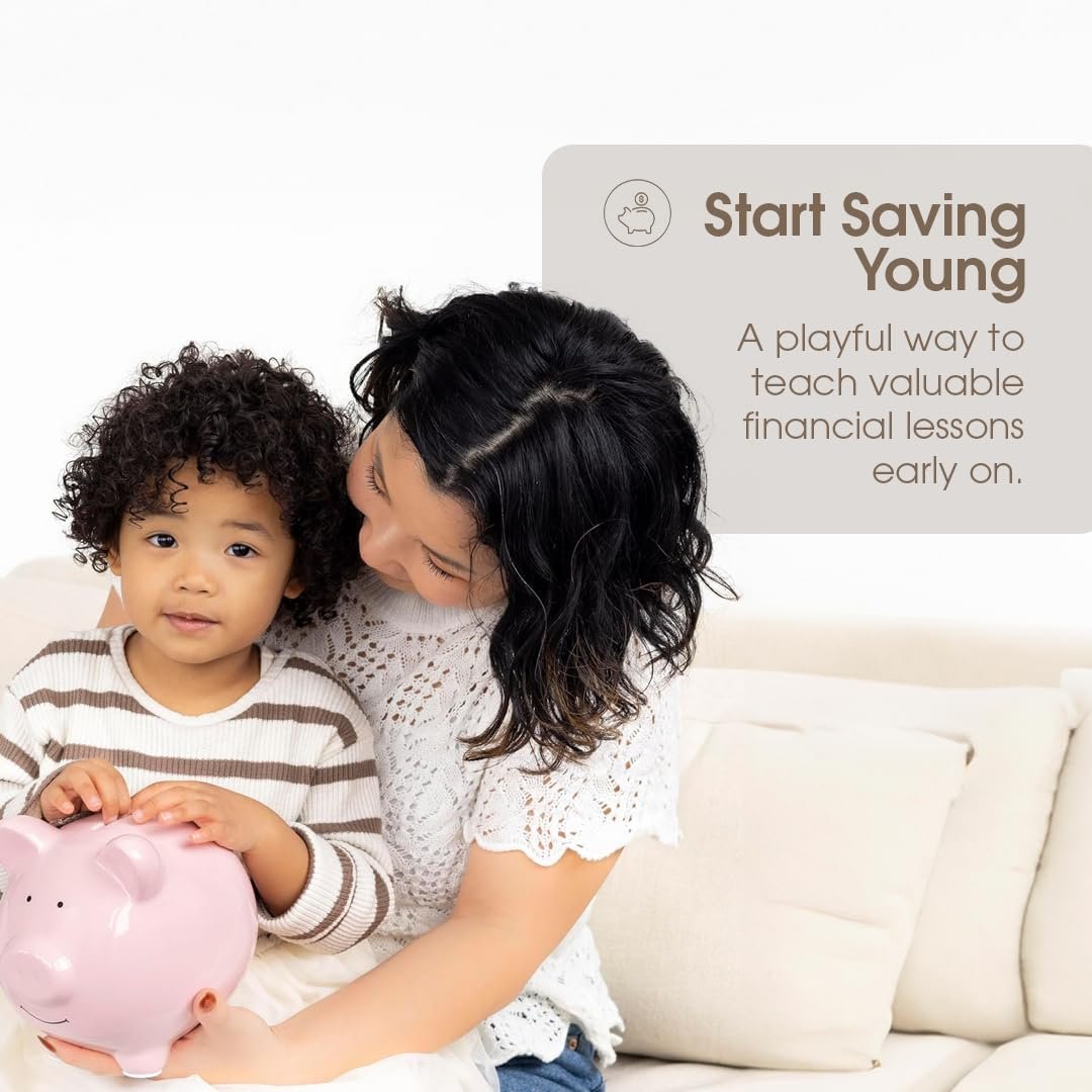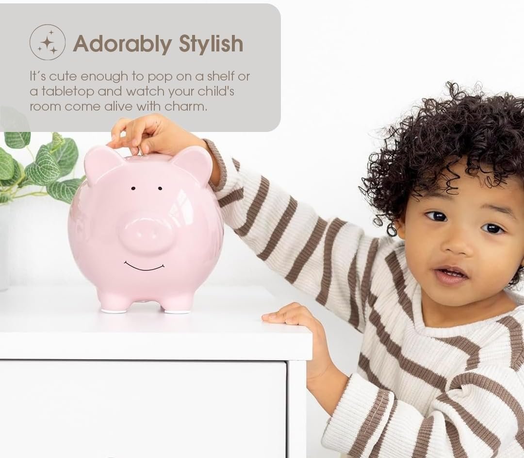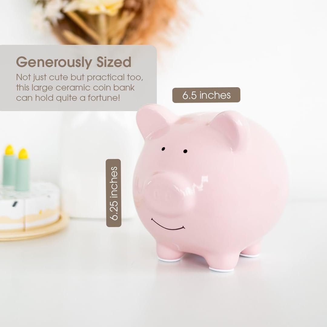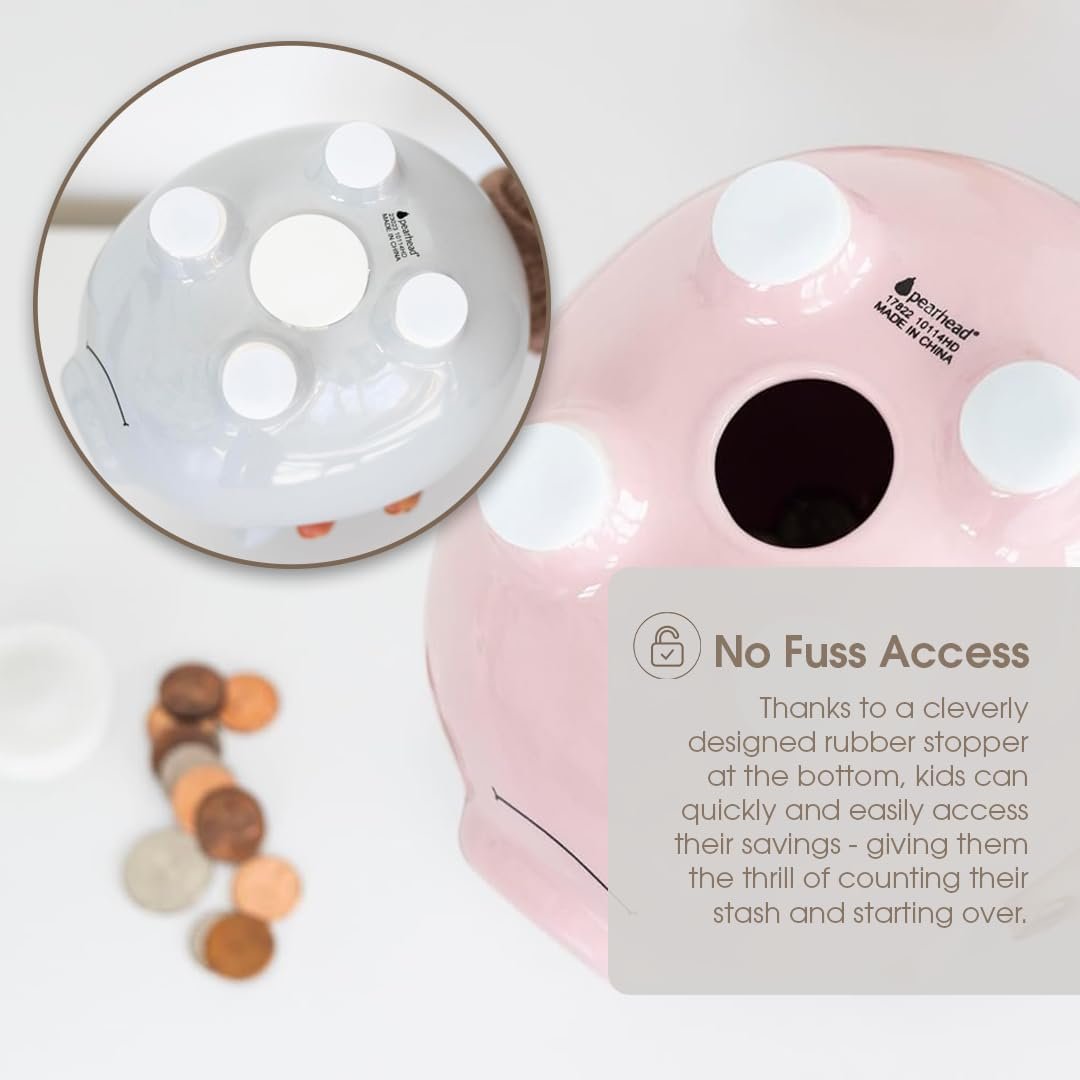 The Pearhead Large Ceramic Piggy Bank in soft light pink is an ideal and charming keepsake, designed to encourage early saving habits in children. Its generous ceramic build easily holds coins and bills, making it a timeless addition to any nursery while its felt-safe base protects furniture. This Pearhead piggy bank makes a practical yet cherished gift for baby showers, birthdays, or any special occasion.