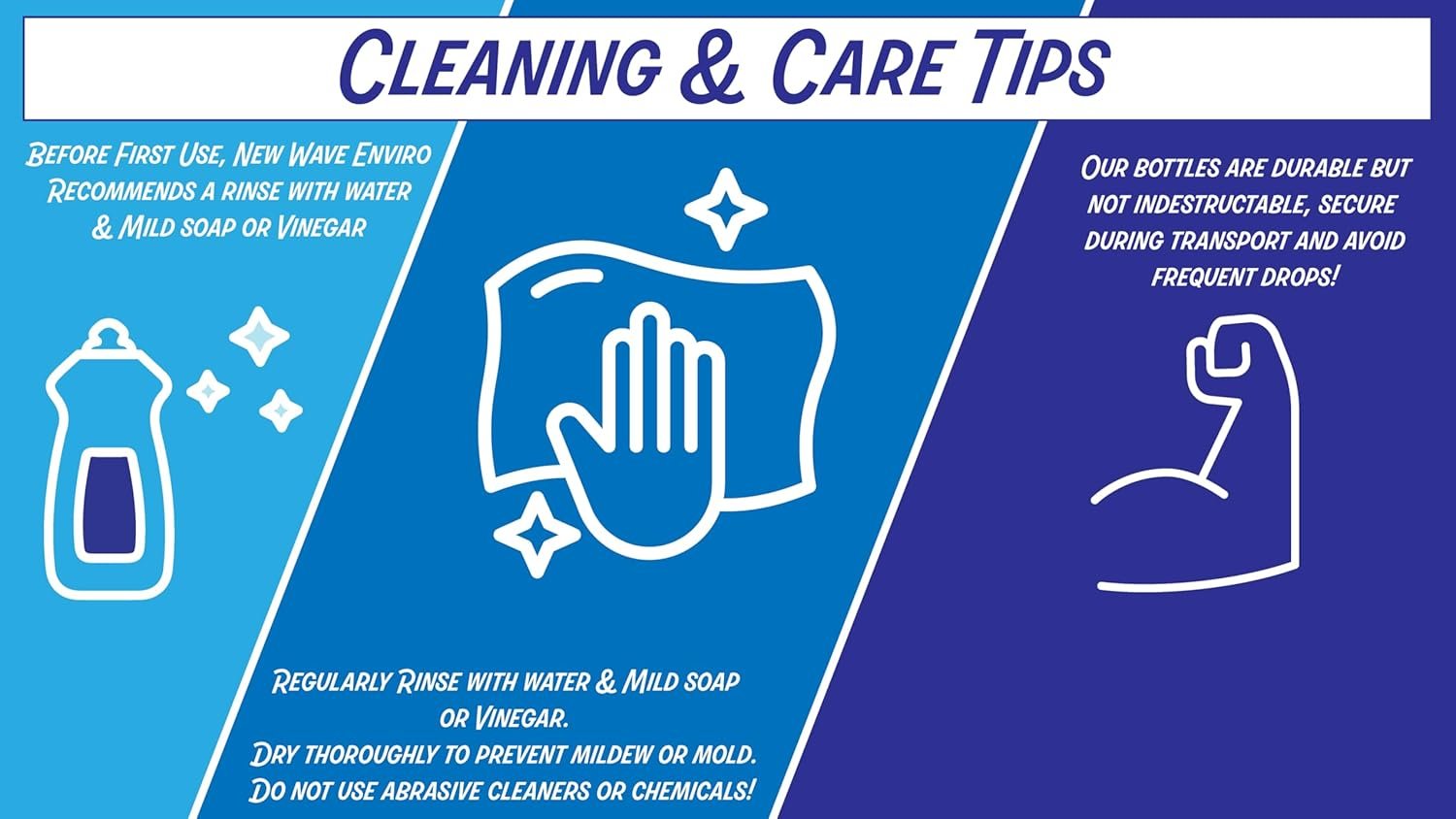 A: This bottle uses BPA-free Tritan resin, which means it does not leach harmful chemicals, ensuring safe, clean, and eco friendly hydration with every refill. See the full certification details on New Wave Enviro’s official site. - Q: How do I clean and care for my large capacity bottle?