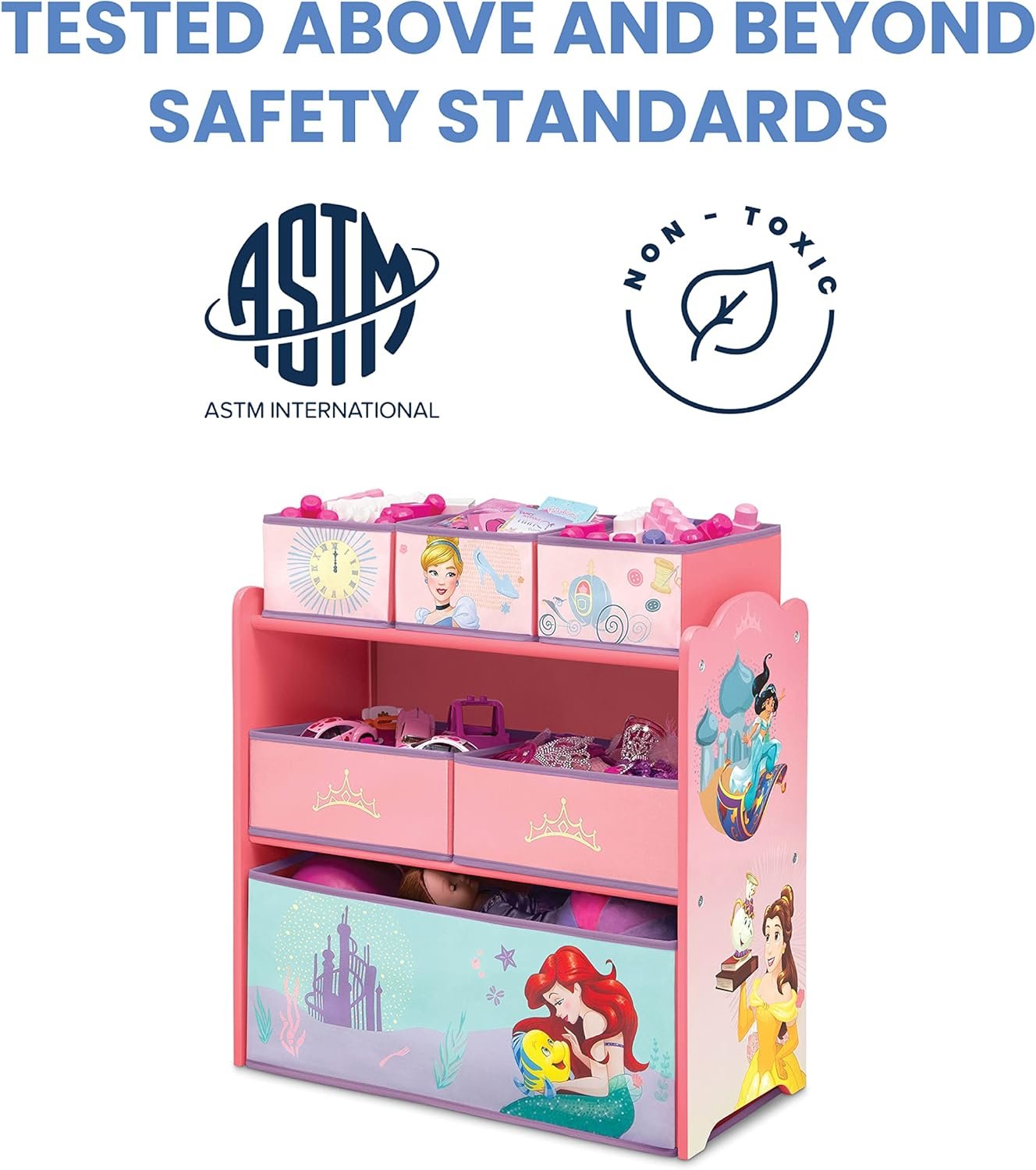 Make tidying magical with the Delta Children Design & Store 6 Bin Toy Storage Organizer, featuring beloved Disney Princesses. This durable, CPSC-safe organizer offers six varied bins for extensive storage and includes reusable stickers for engaging, creative play. It's the perfect enchanting and practical solution to encourage neatness for ages 3+.