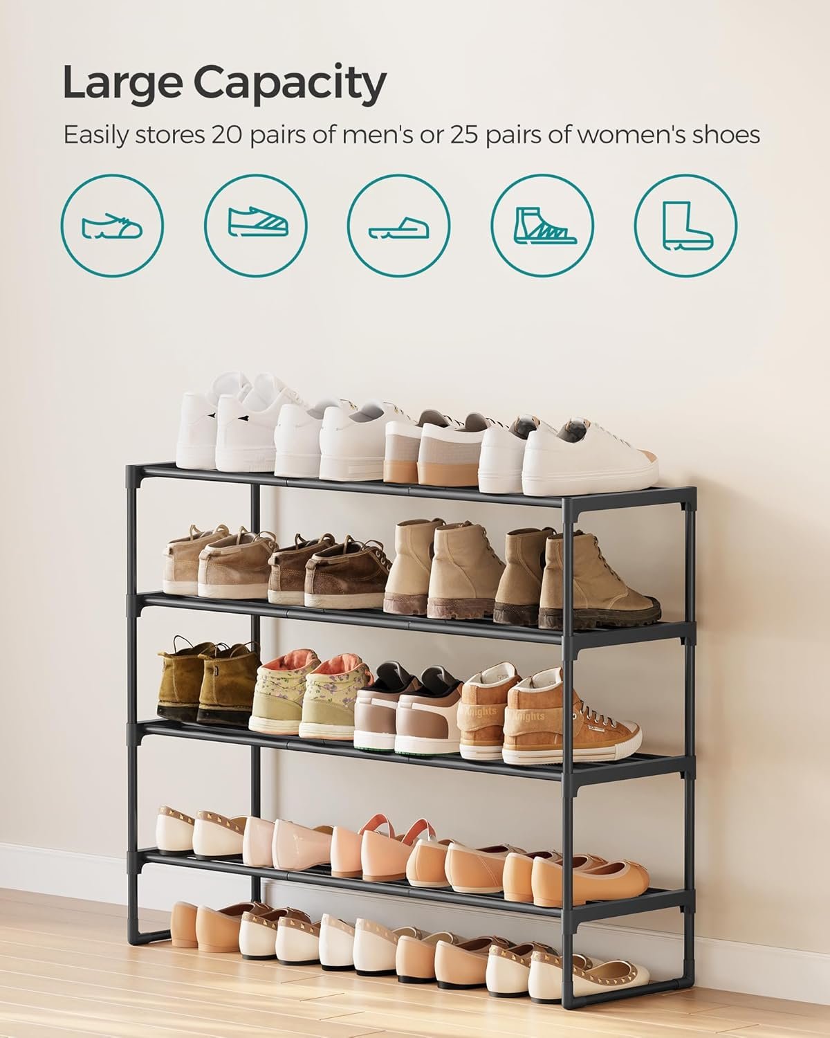The SONGMICS Shoe Rack is a flexible, robust 4-tier organizer that stores up to 25 pairs of shoes, stacking to maximize entryway space. Easy to assemble and clean, this durable metal shelf from SONGMICS is perfect for keeping your footwear tidy and accessible.