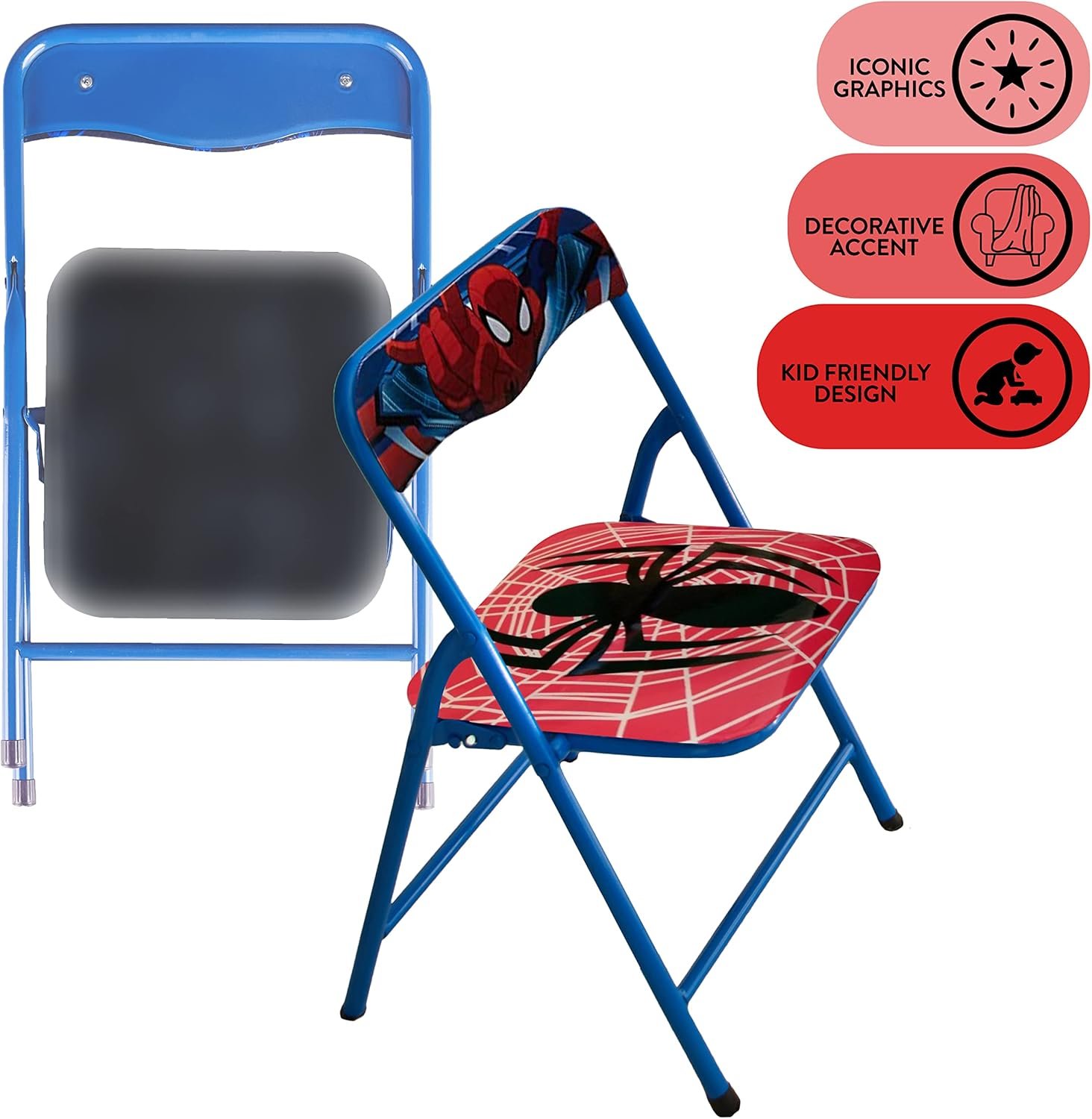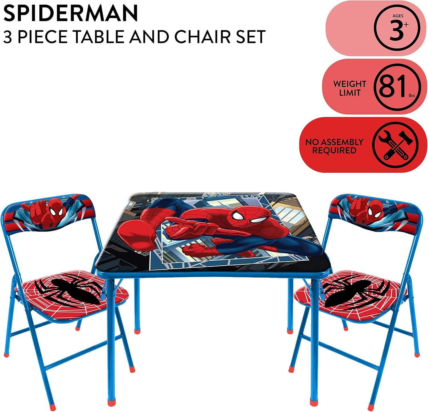 Unleash your child's imagination with the Idea Nuova Marvel Spiderman 3 Piece Children's Activity Square Table and Chair Set, ideal for ages 3+. This durable, steel-framed set features a vibrant Spiderman design, perfect for everything from crafts to meals, and easily folds for convenient storage and transport.